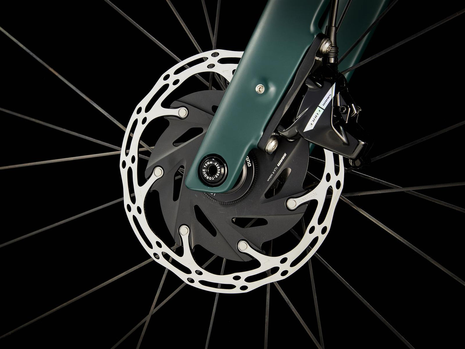 Gabel: Domane+ Carbon, konischer Carbongabelschaft, interne Bremszugführung, Schutzblechösen, Flat Mount Scheibenbremsaufnahme, 12x100 mm Steckachse