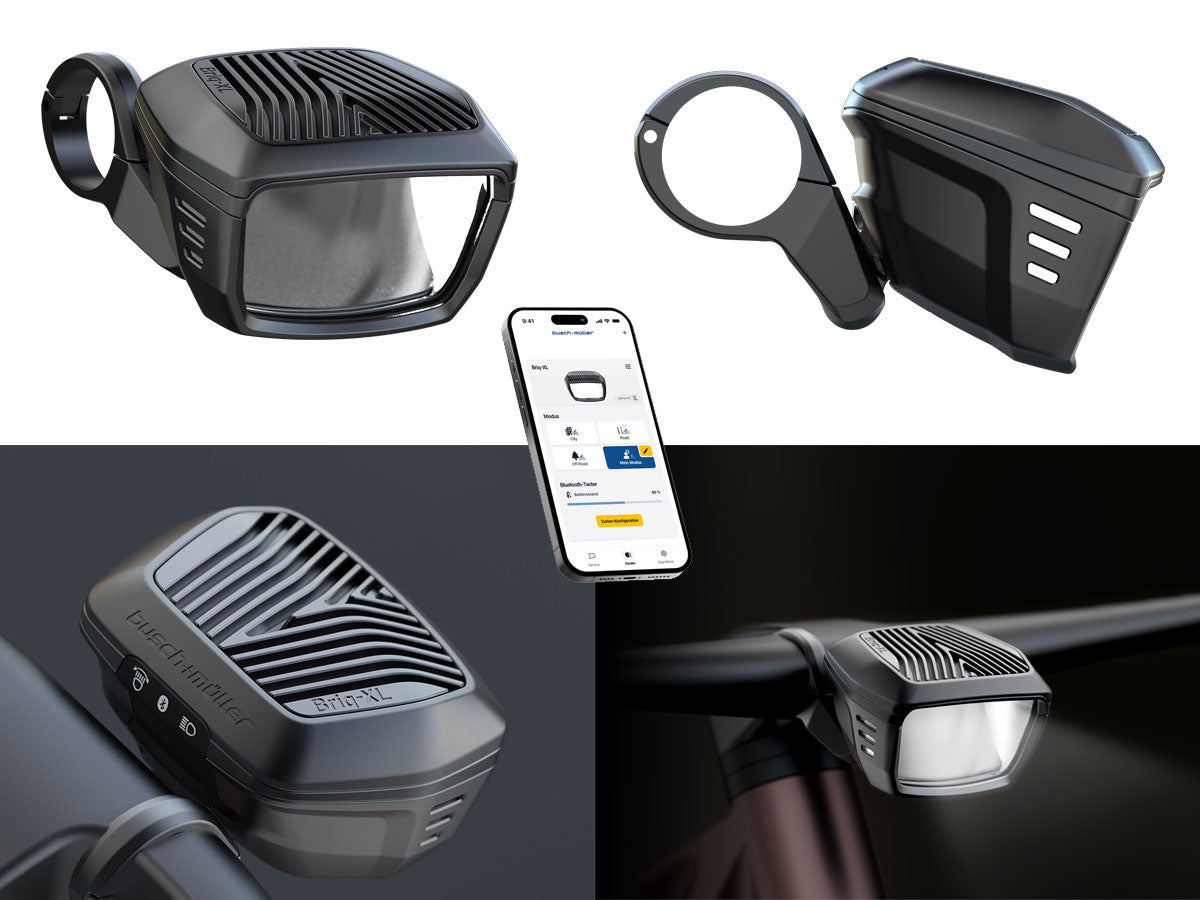 Der Briq-XL-Scheinwerfer kann per Bluetooth mit der Busch+Müller-App gekoppelt werden, um das Lichtfeld anzupassen. Neben drei vorinstallierten Modi, City, Road und Offroad, können unter „Mein Modus“ Merkmale wie Abblend-Fernlicht-Verlauf, Tagfahrlicht, Leuchtbreite und -weite individuell eingestellt werden. Bis zu vier Modi (zwei je Taster) lassen sich mit der App auf den Bluetooth-Lenkertaster konfigurieren.