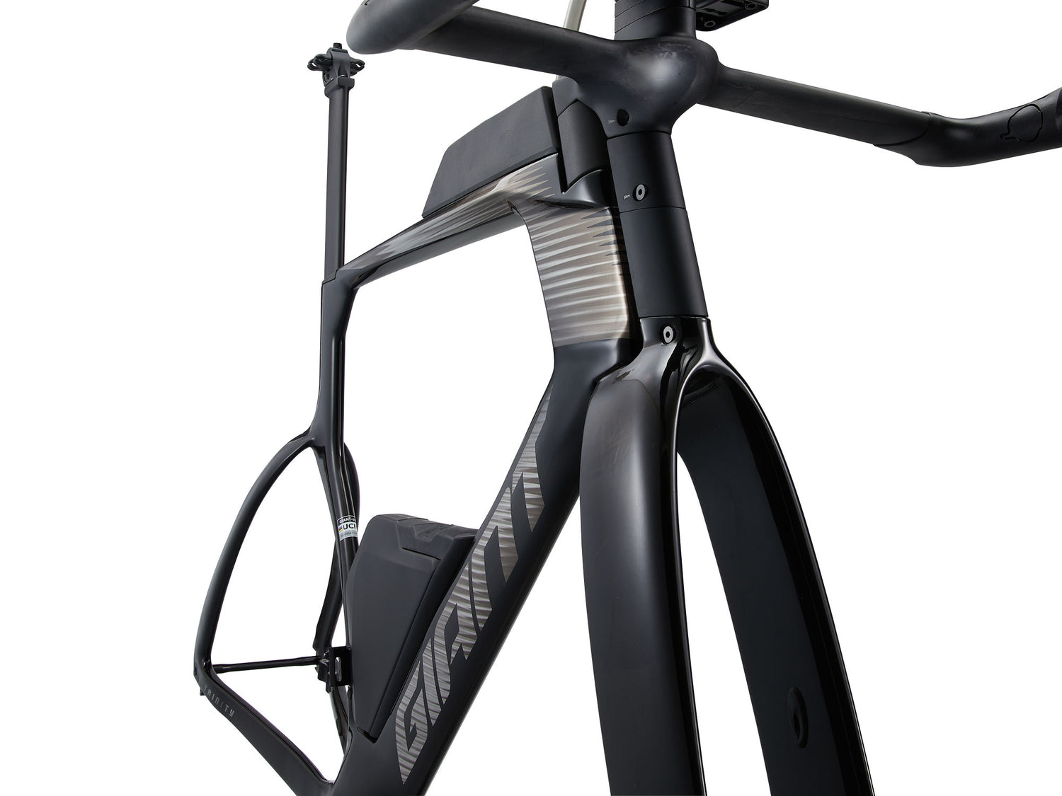 AeroSystem-Technologie mit einem ellipsenförmigen Rohr für einen 5,9-Watt-Luftwiderstandsvorteil und ein besseres Verhältnis von Steifigkeit zu Gewicht gegenüber der vorherigen Trinity Generation. Darüber hinaus bilden der Trinkbehälter, die Flaschen und die Bento-Box ein aerodynamisch optimiertes, integriertes Trinksystem.