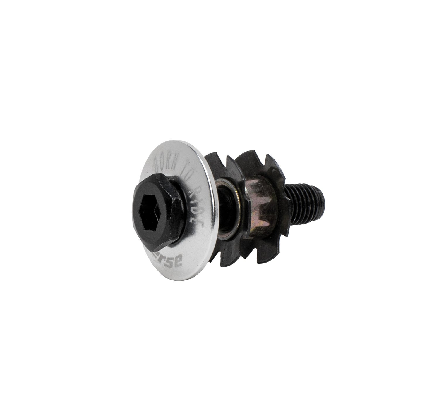 Das Set beinhaltet eine Hohlschraube inkl. Steuerrohrkralle und eine lasergravierte "Born to Ride" Aluminium Top Cap.