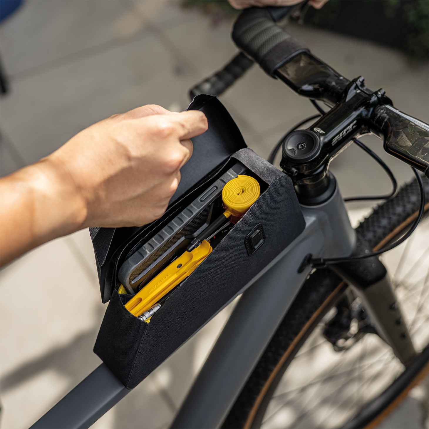 Wetterfeste Oberrohrtasche mit Klappdeckel und schlankem Design