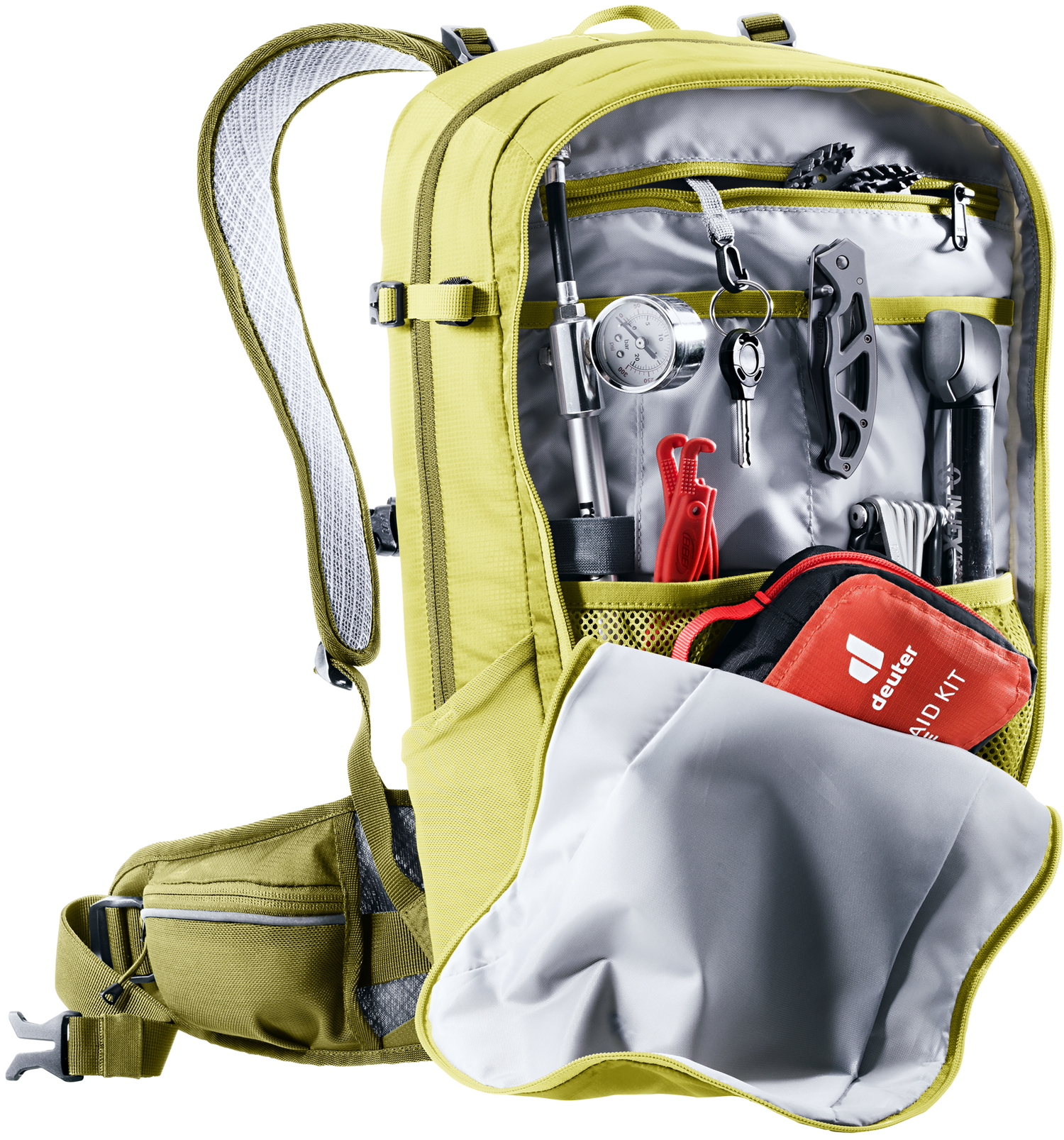 - Vortasche mit großem Organisationsteil und RV-Netztasche für Schlauch, Werkzeug und Pumpenhalterung
