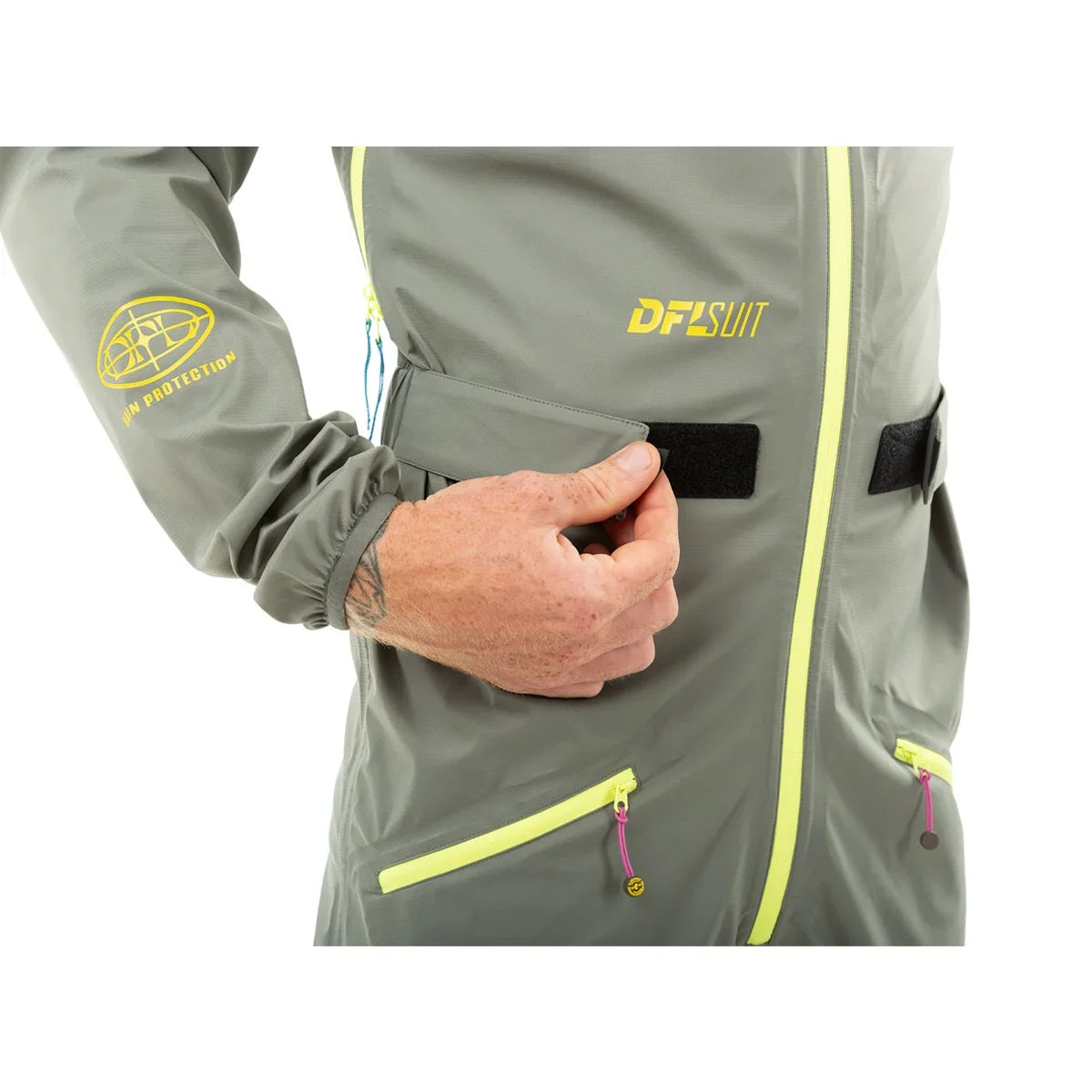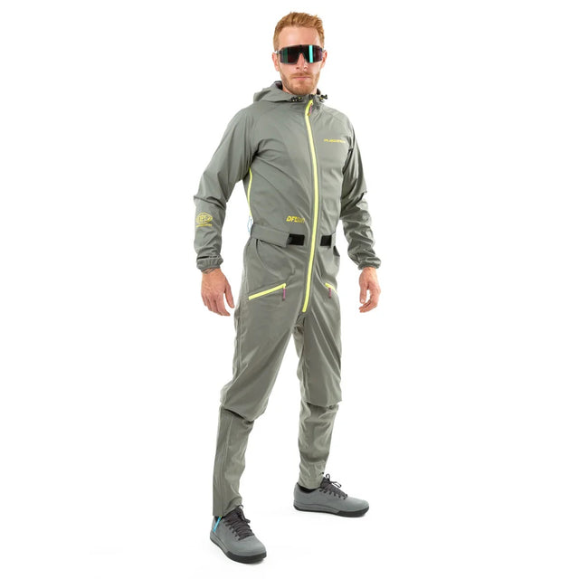 Der neue DFL Suit Lang ist die Antwort auf Regen, Wind, Pfützen, Matsch und Dreck. Mit 10000mm Wassersäule genau das Richtige für Trailfahrten in strömendem Regen. Wenn eigentlich alles gegen das Radfahren spricht, hast du im DFL Suit Lang, ohne durchnässt zu sein, massig Spaß auf nassen Trails. Die große Kapuze passt locker über den Helm. Die Bundweitenverstellung lässt sich optimal an deine Bedürfnisse anpassen und unsere Unterarmbelüftung sorgt für die nötige Durchlüftung. Der Suit ist körpernah geschnitten, kann also ideal alleine als Top Layer getragen werden, passt aber auch über eine normale Hose, wie ein klassischer Regenanzug.